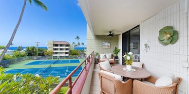 Ocean View Lanai where you can start your day with a cup of Kona coffee in the morning or toast to another stunning sunset in the evening. Our well-appointed condo at White Sands Village provide the ideal blend of comfort, convenience, and island charm. Out Lanai Overlooks the newly added Pickle ball courts. We also provide rackets and balls for our Guest use.